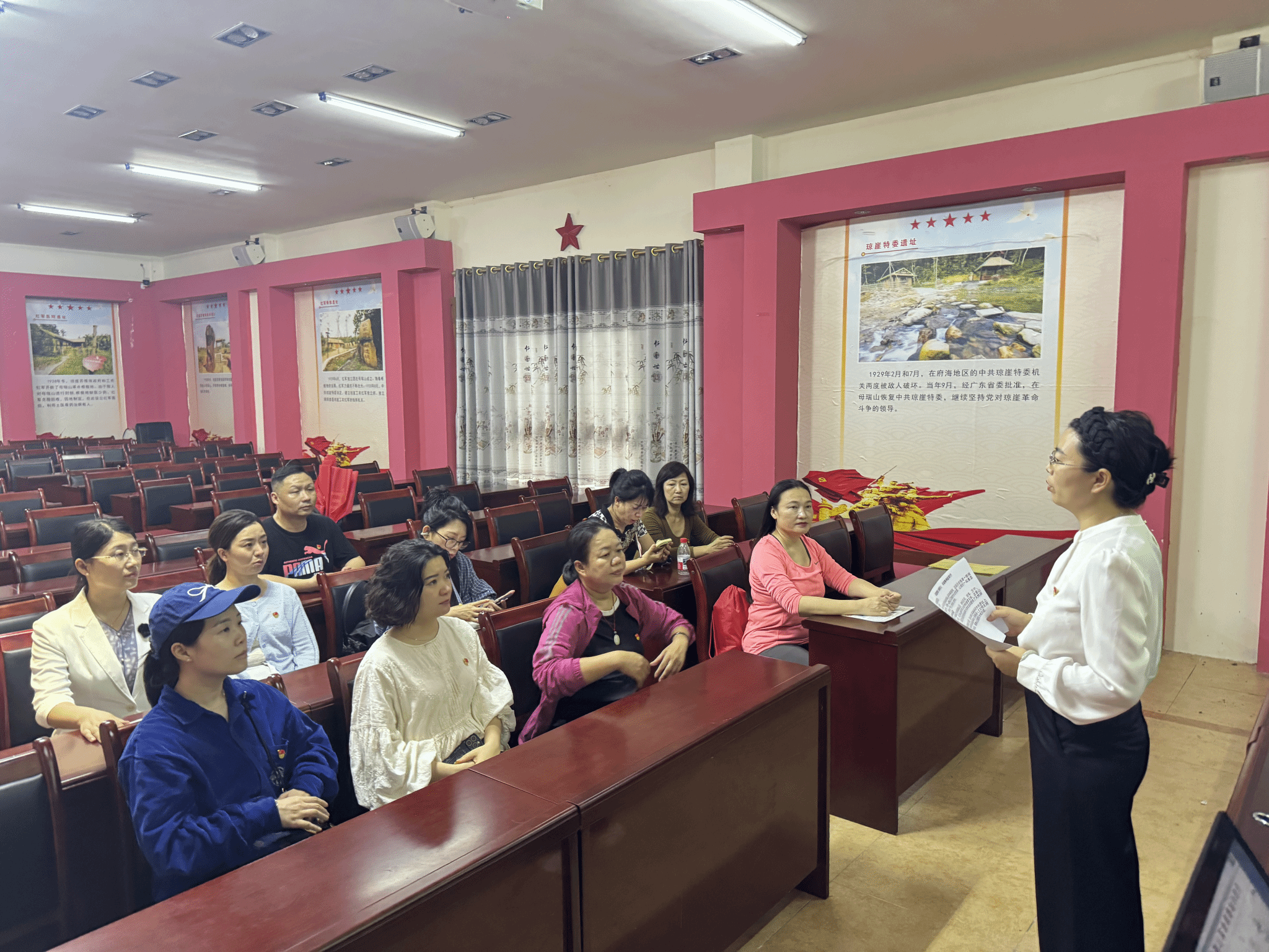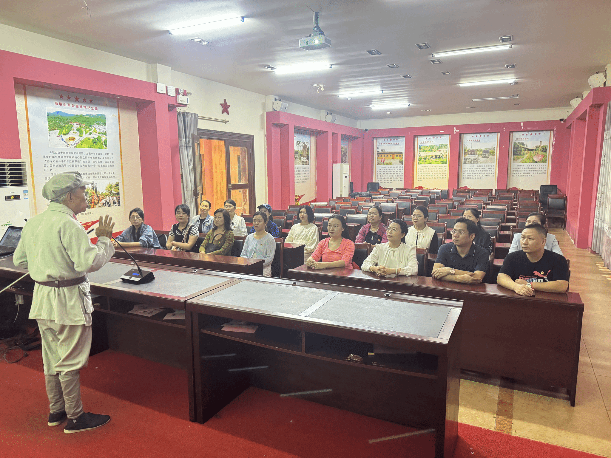 活动伊始,党员们步入琼崖革命斗争历史馆,一幅幅珍贵的史料图片、一件件承载记忆的革命文物,系统展现了琼崖红军在母瑞山两次保存革命火种的壮阔历程。80余岁的纪念园老馆长王学广深情讲述,将1932年反“围剿”斗争中红军战士以“革命菜”充饥、用芭蕉叶御寒,最终26名勇士成功突围的故事娓娓道来,让在场党员深刻体会到琼崖革命“二十三年红旗不倒”的革命精神。