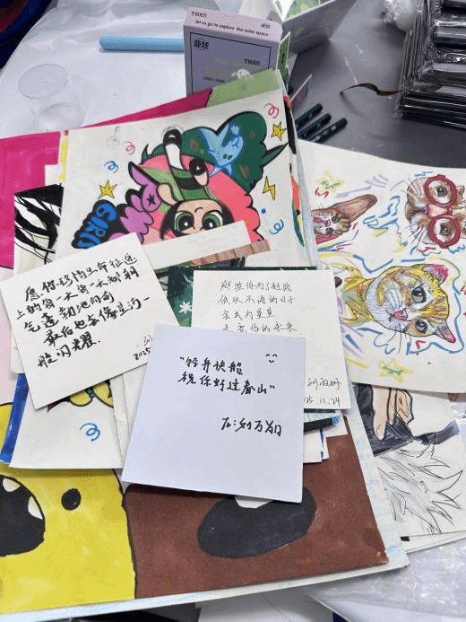 下课铃声响起,孩子们纷纷举起自己的作品:色彩斑斓的小房子、灵动的卡通形象、充满幻想的童话世界,每一幅画都承载着他们天马行空的创意。志愿者们还为孩子们准备了手写祝福卡片,“轻舟快舵,祝你好过春山”“愿你珍惜生命征途,每一天都朝气蓬勃”,一句句温暖的寄语,连同美术作品一起,被孩子们小心翼翼地收进书包。