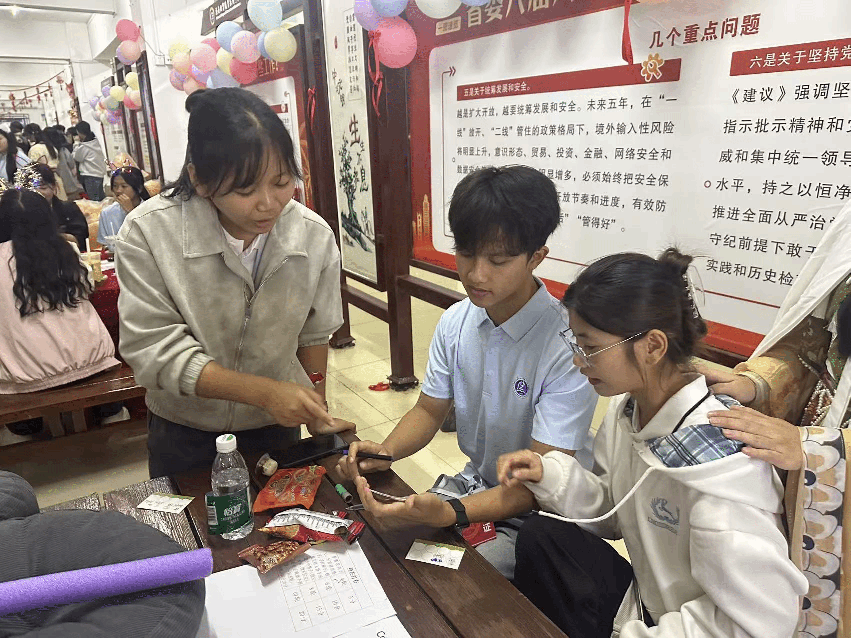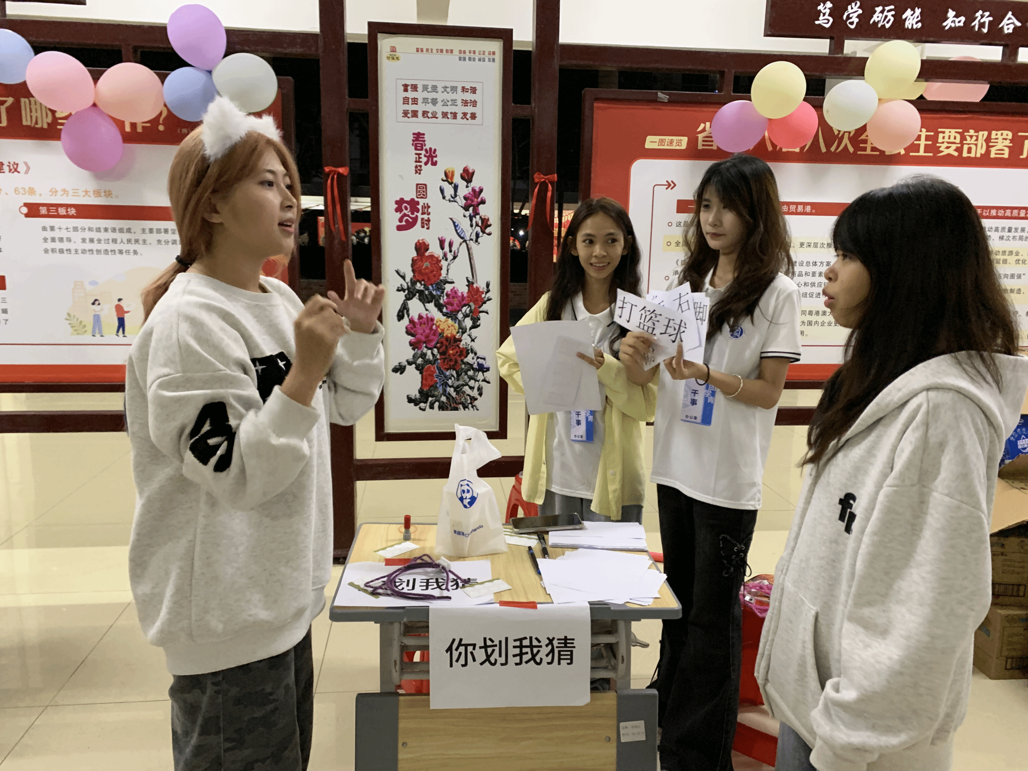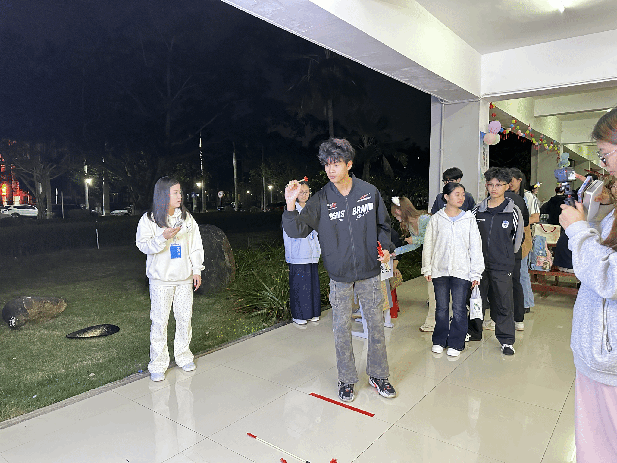 游园会现场热闹非凡,志愿者们穿梭于各个活动区域,以热情地引导、耐心地讲解,成为了现场一道温暖亮眼的风景线。积分区设置的“投壶“、“你划我猜”、“抢瓶大作战”等五大趣味游戏各具特色,志愿者们认真记录积分、严格维持秩序,全力保障各项游戏公平有序开展;自由区的套圈游戏更是人气爆棚,参与者在 2 米外精准投掷,各式各样的惊喜奖品接连入账,现场欢呼声此起彼伏,热闹非凡。