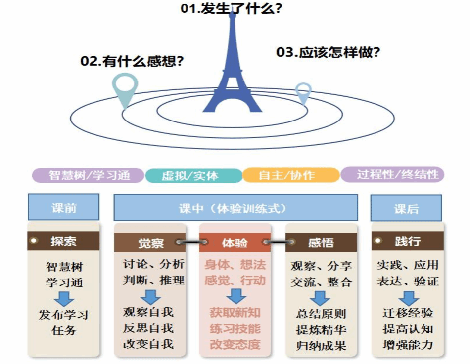 “三阶段”,指的是员工在学习过程中会经历三个问题步骤“发生了什么”“有什么感想”“应该怎样做”。首先让员工自主探索课题相关知识,其次促使员工对学习活动中的行为反思整合,最后通过回顾总结转化为能力提升。