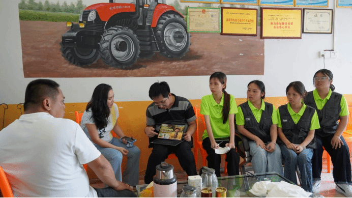 团队走进定安县翰林镇山村园,与全国劳动模范王上南交流。王上南担任定安翰林农旺农机服务农民专业合作社理事长,从事农业农机行业20年,创立富硒香米品牌,破解撂荒难题,整合翰林镇385亩撂荒田,集中种植富硒香米、毛豆;研发自主专利的开沟起垄机,作业效率提升40%,并将农机技术推广至周边乡镇,带动区域机械化率提升,有力助力当地乡村振兴发展。
